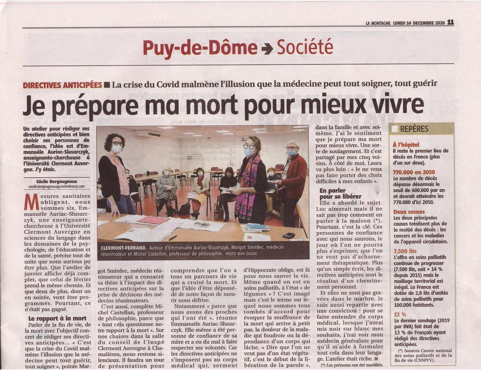 Un premier atelier s'est tenu le 8 décembre 2020 : Article La Montagne "Je prépare ma mort pour mieux vivre" et un second le 11 janvier 2021.